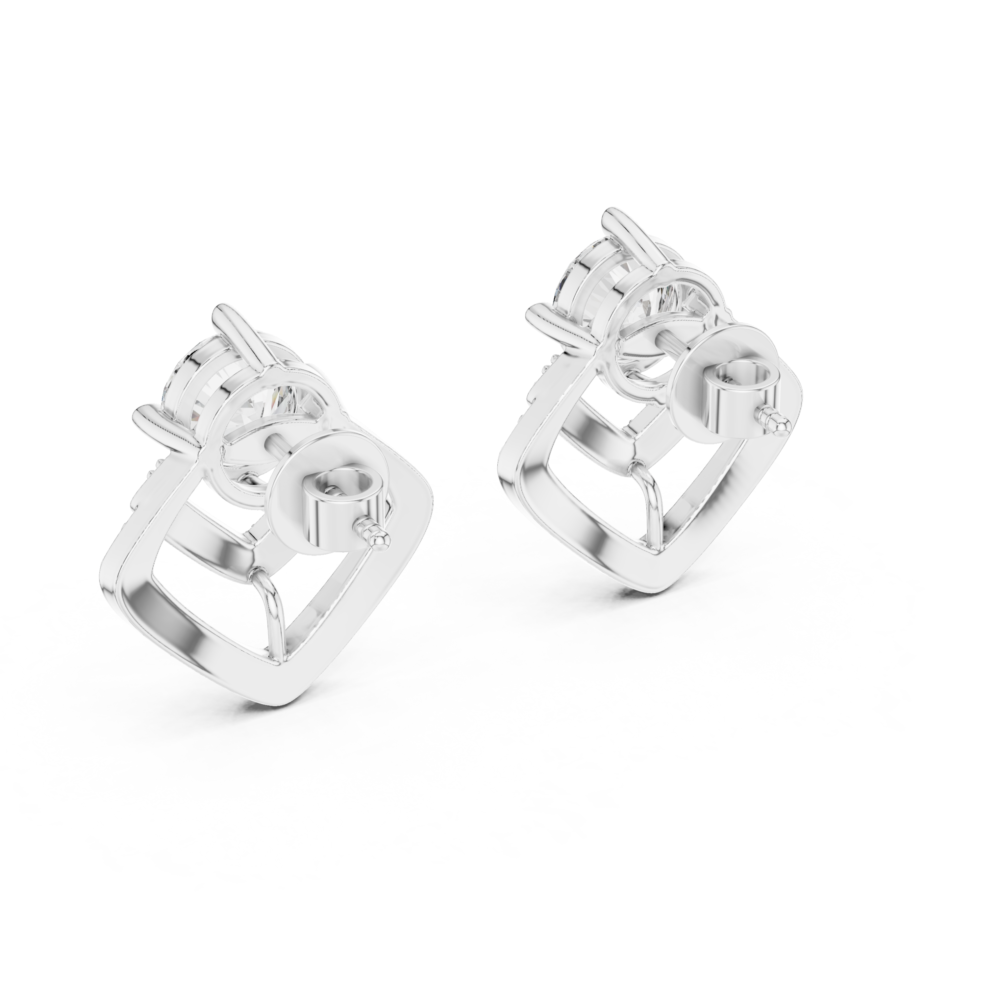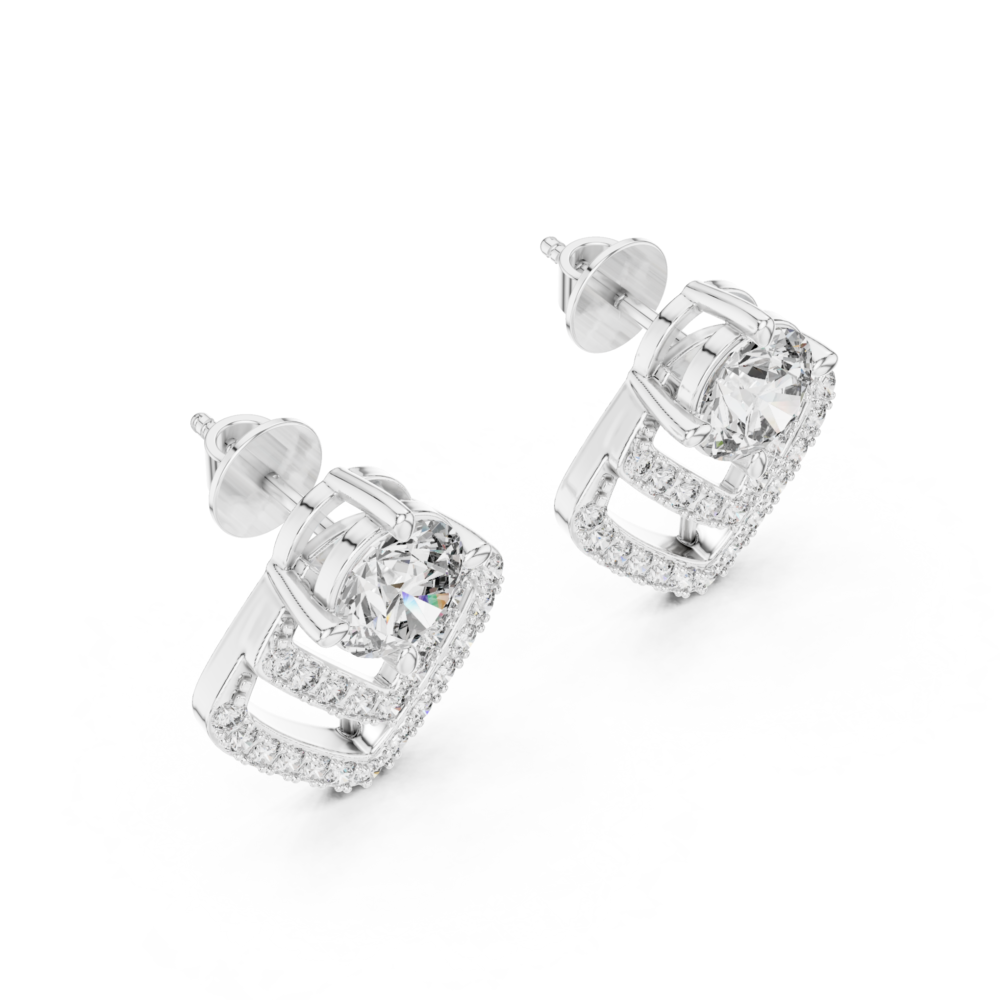 These striking earrings feature an architectural V-shape frame adorned with multiple accent stones, topped with a prominent round solitaire. The geometric "chevron" design provides a structured, modern aesthetic that frames the face beautifully. With a total height of nearly 20mm, they offer the presence of a drop earring with the comfort of a stud. They are the perfect choice for the fashion-forward individual.