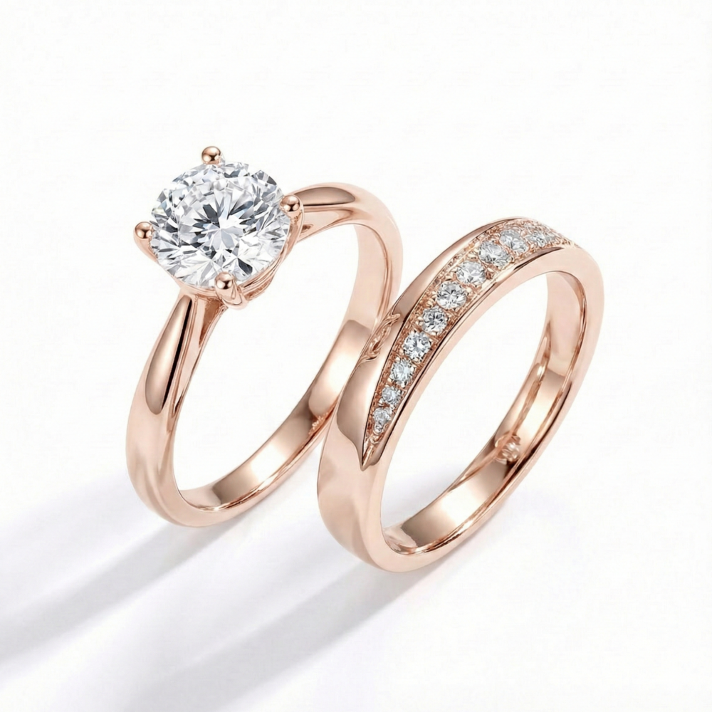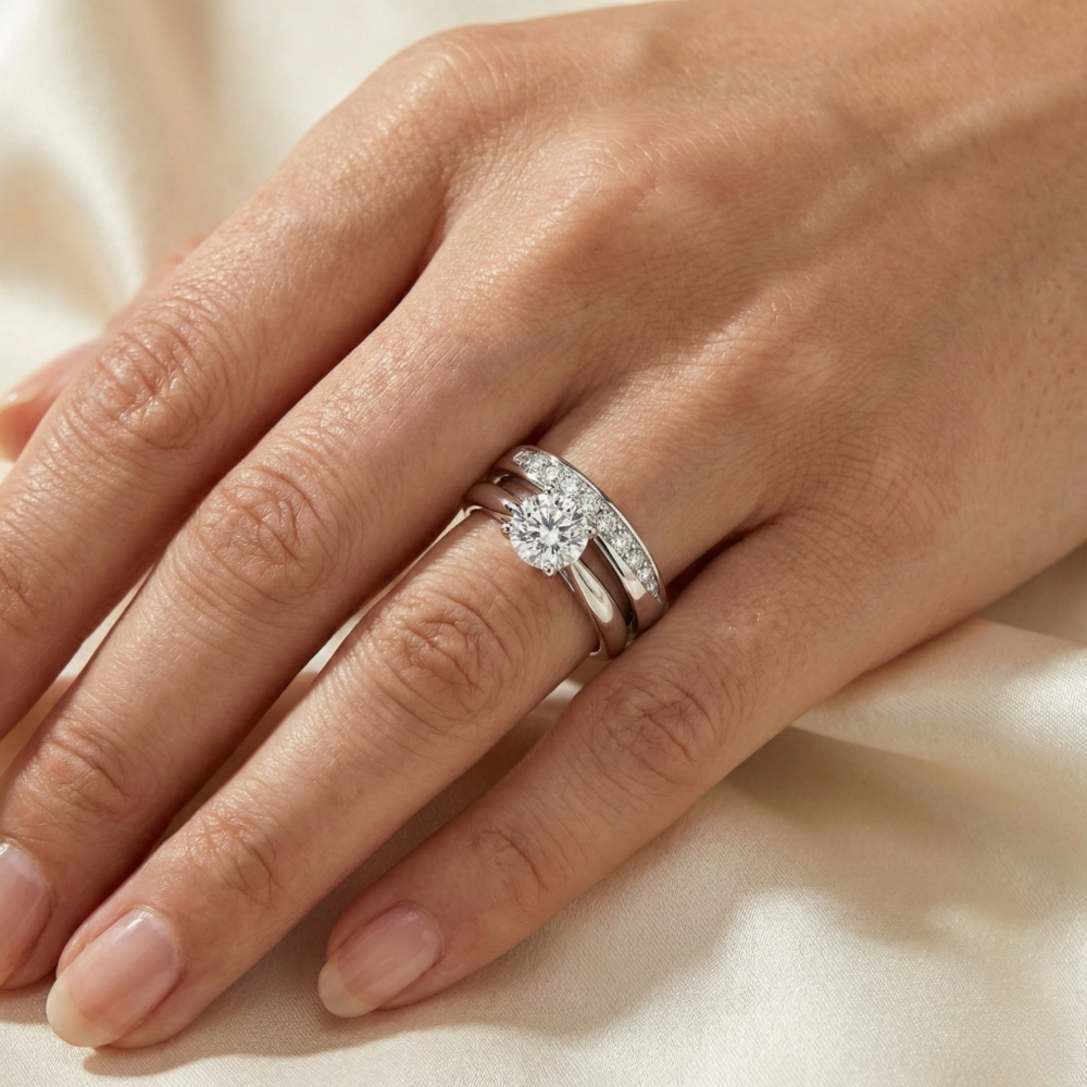 This set pairs a V-shaped diamond band with a classic solitaire ring, designed to nest perfectly together. The V-guard band frames the center stone and adds extra sparkle to the set. Worn together, they create a modern, tiered look that is both elegant and striking. A beautiful bridal choice for someone who loves clean lines and statement shine.