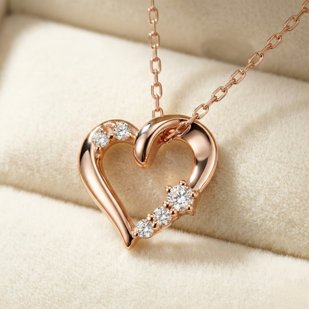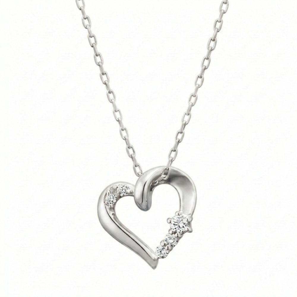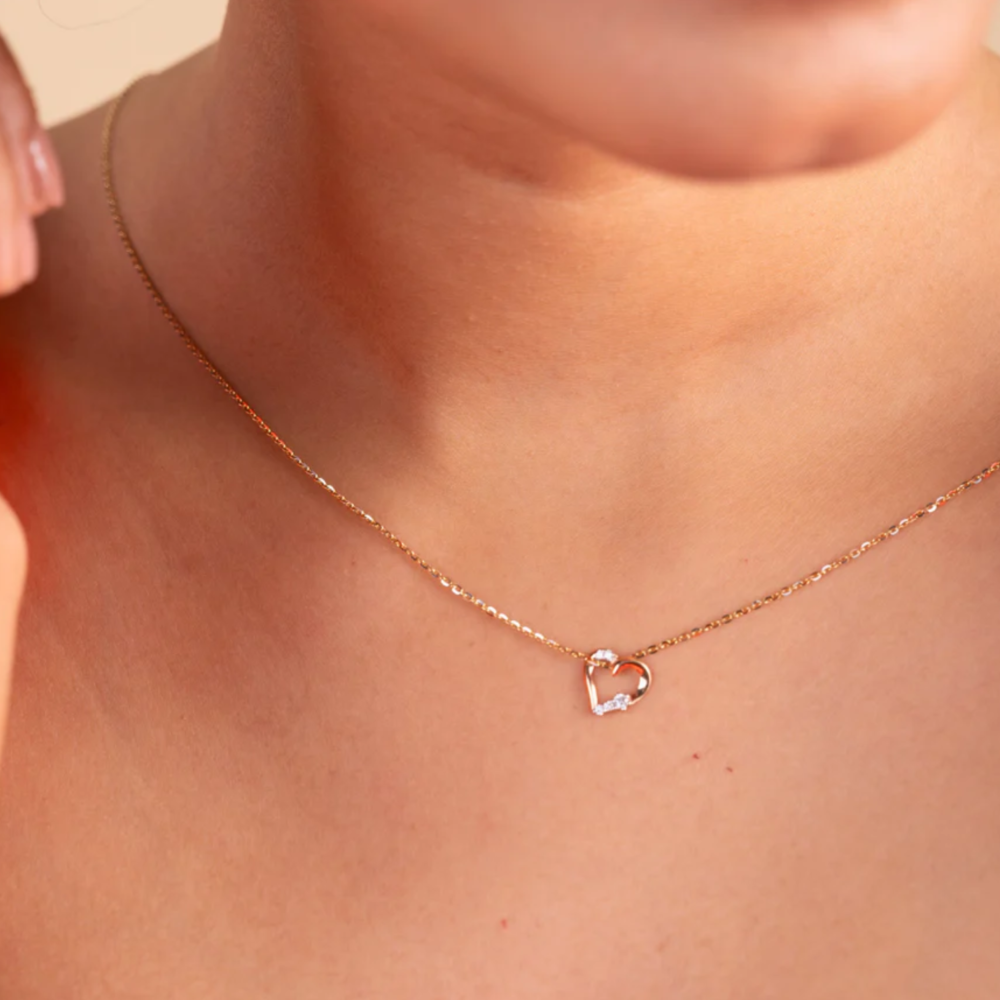 This pendant features a softly curved heart design accented with graduated lab grown stones along one side. The asymmetrical shape gives it a modern, artistic feel. Light and feminine, it sits beautifully on the neckline for everyday wear. A lovely pick for someone who prefers unique yet subtle romantic designs.