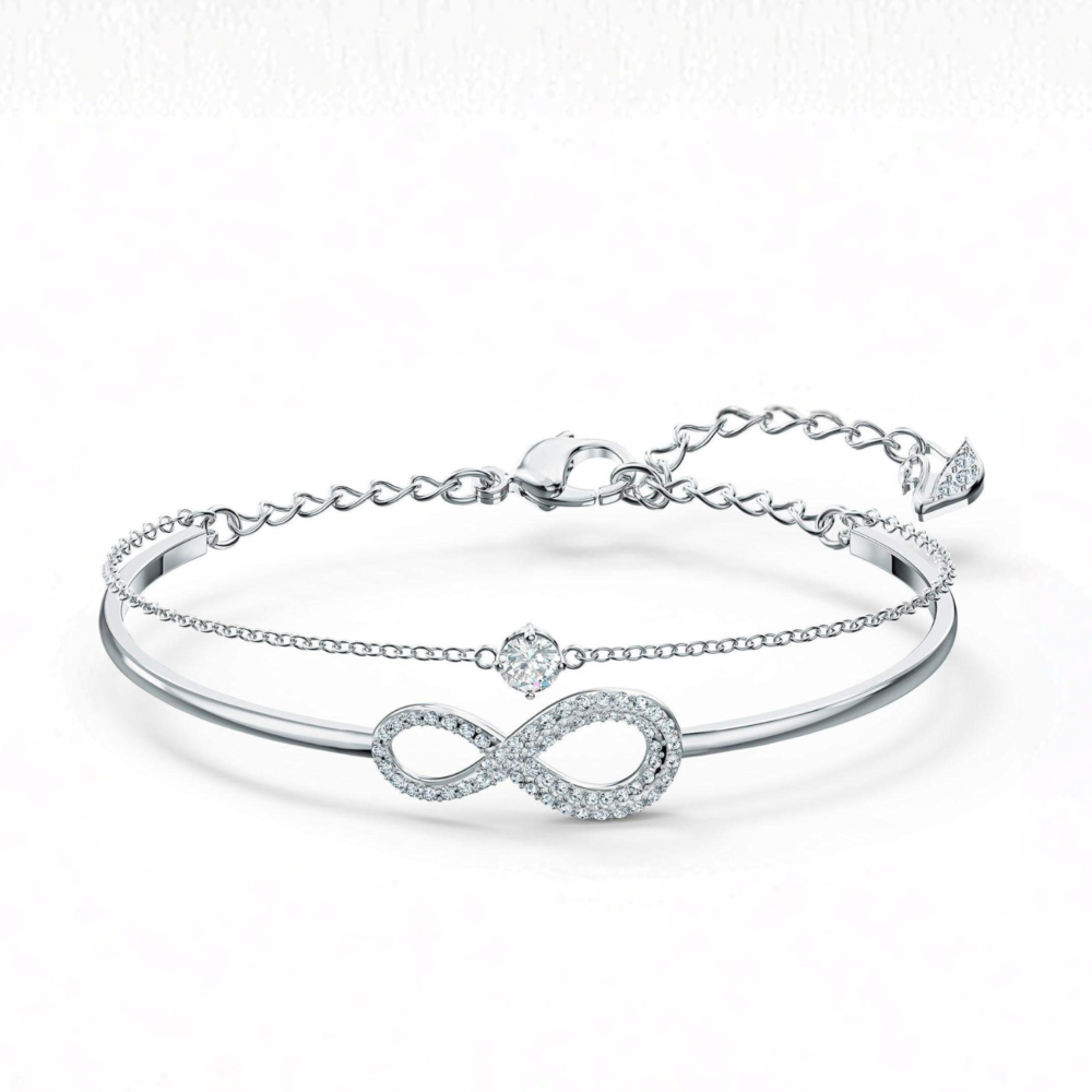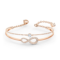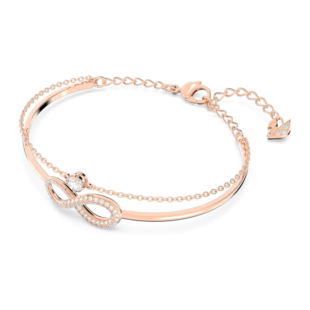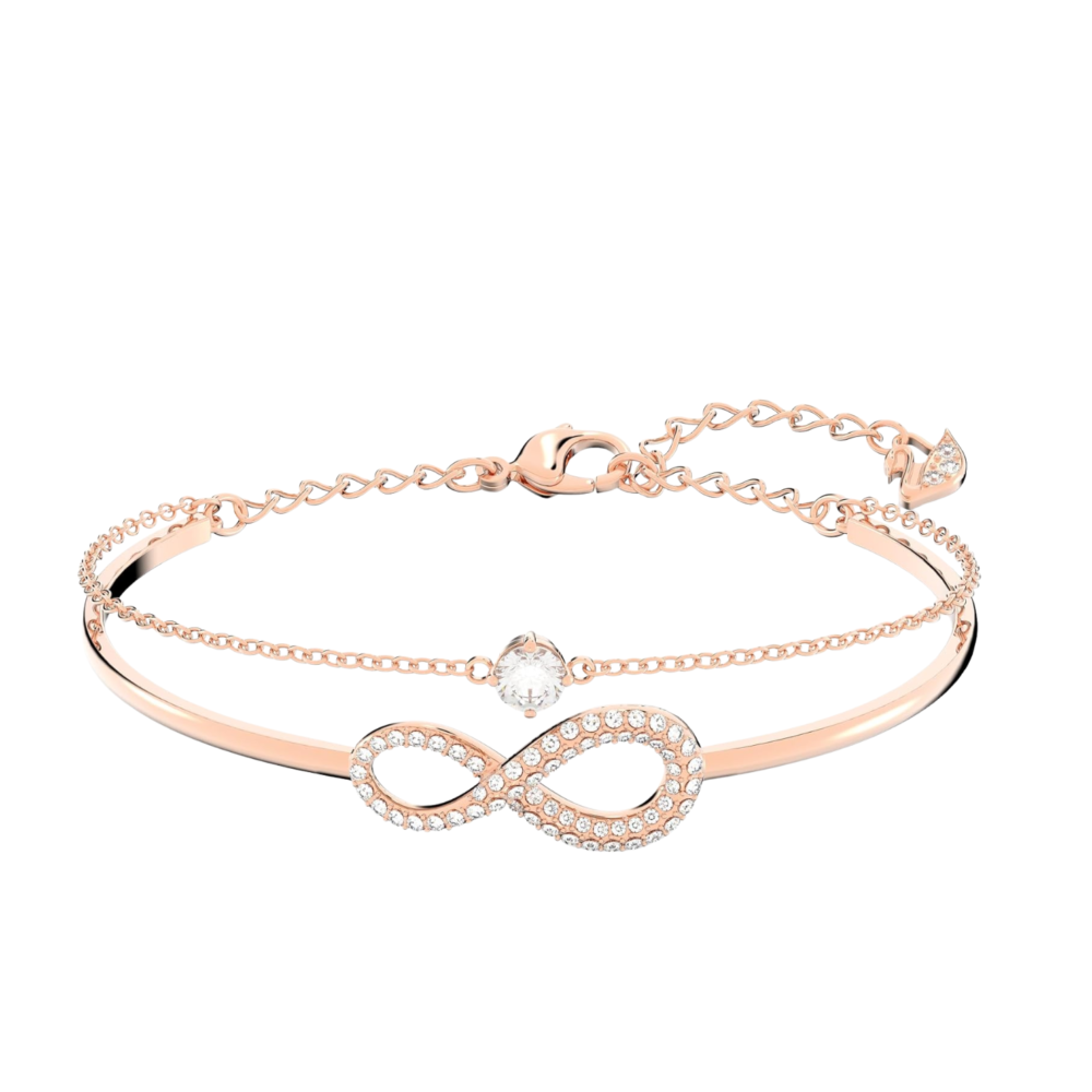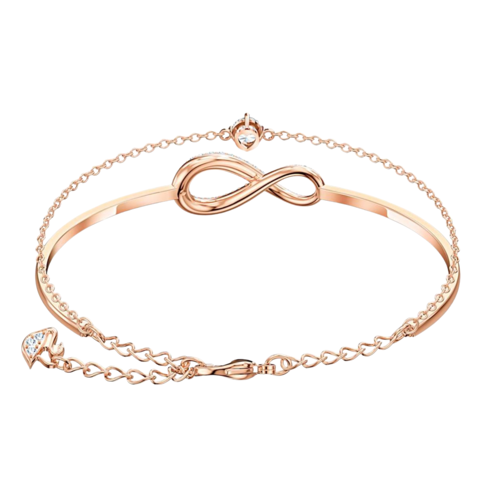 A polished rose gold bangle flows into an infinity motif adorned with small stones and a single central solitaire. The open design keeps it lightweight and comfortable for all-day wear. It layers beautifully with watches and other bracelets while still standing out on its own. A symbolic gift representing endless love and connection.