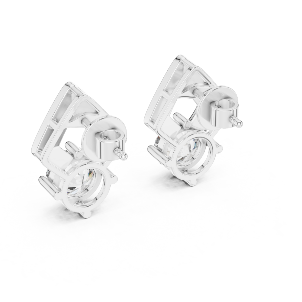 These avant-garde earrings blend sharp architectural lines with the soft brilliance of a round 7.00mm solitaire. The center stone is cradled beneath a triple-layered chevron frame that adds dynamic height and a contemporary edge to the design. Reaching over 18mm in total height, they make a bold geometric statement while maintaining a refined aesthetic. Ideal for the modern trendsetter looking for jewelry that doubles as art