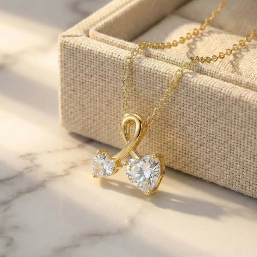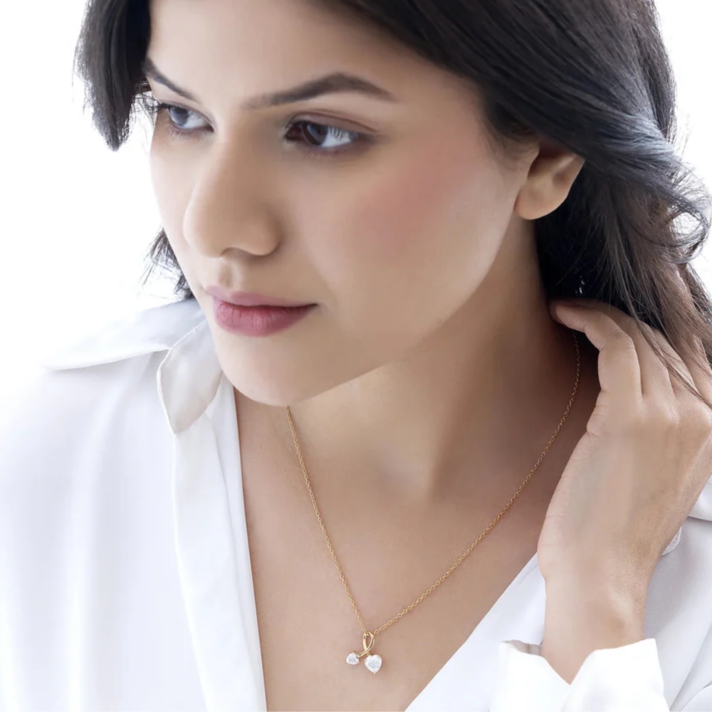 This pendant features a heart-shaped stone paired with a round accent, arranged in a gentle drop style. The rich yellow gold detailing adds warmth and a classic Indian-inspired elegance. Perfect for pairing with both everyday outfits and festive looks. A beautiful choice for gifting during Valentine’s, birthdays or special celebrations.