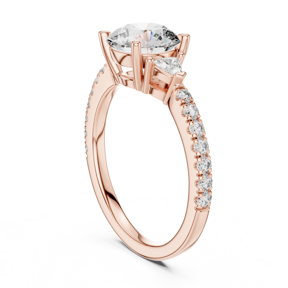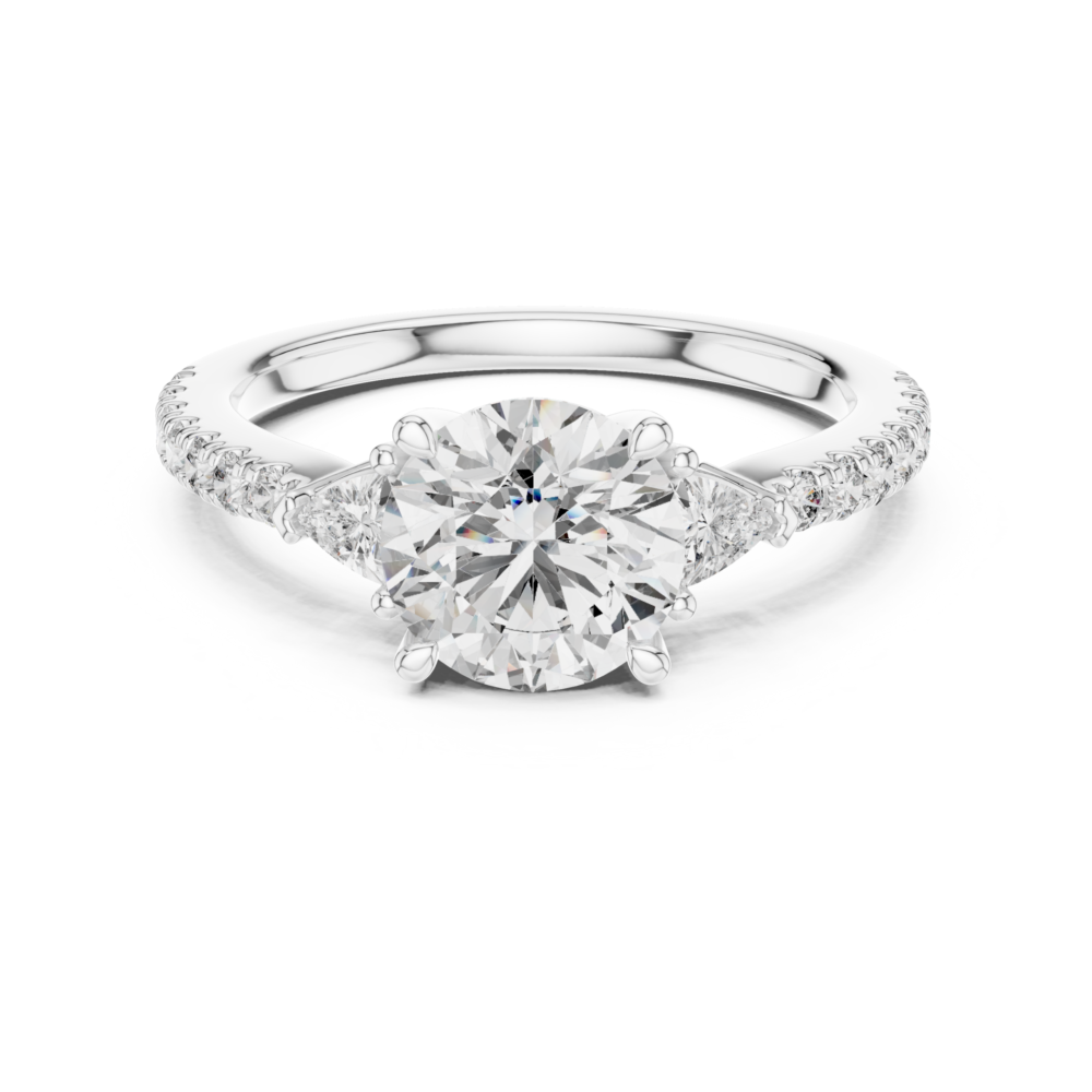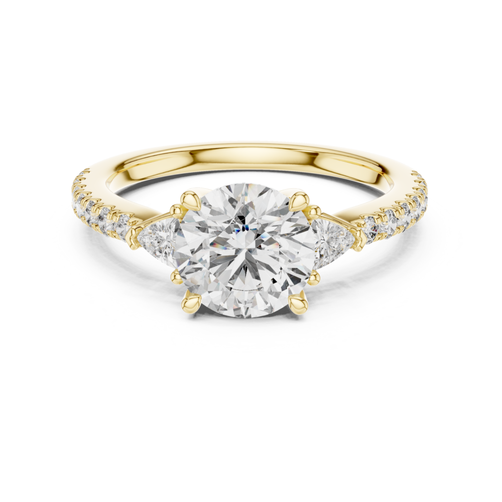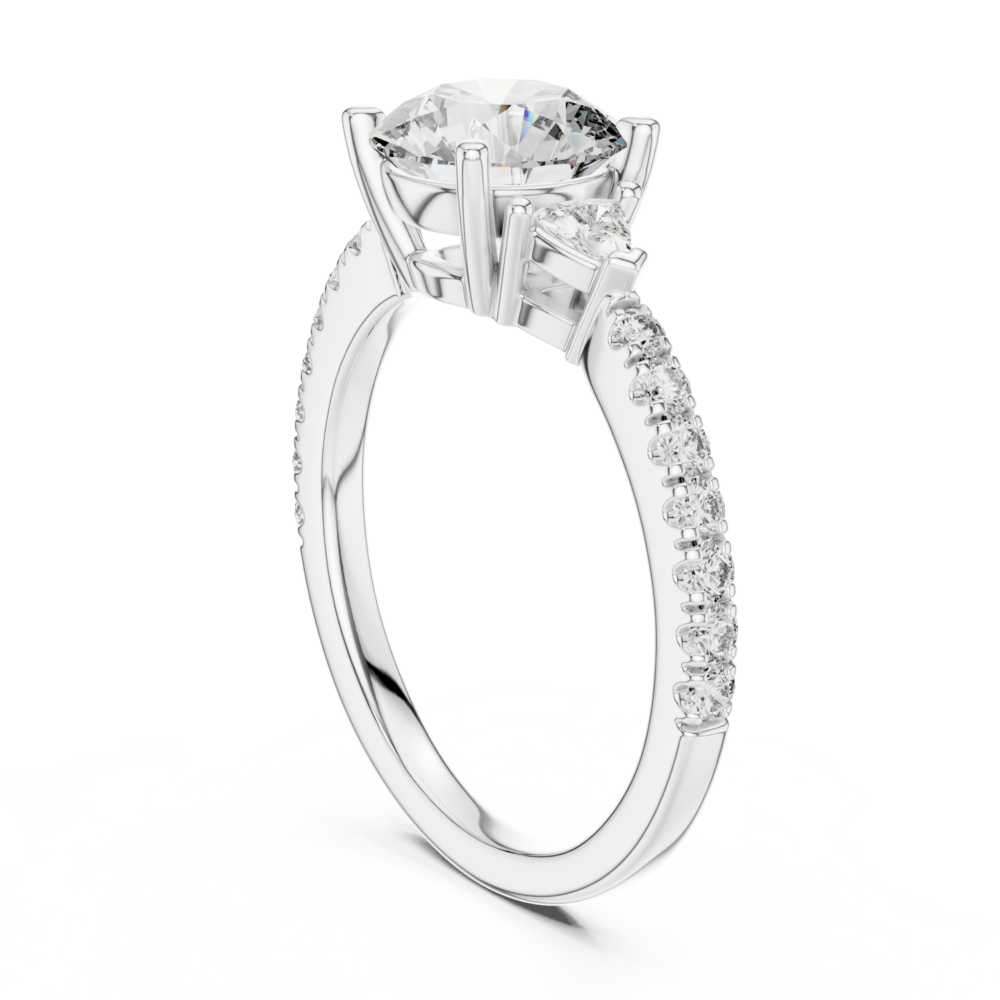 Elegant and refined, this ring showcases a round brilliant center stone accented by tapered pear-shaped side diamonds. The pear sides create a delicate transition from the center stone to the band. It is a graceful and harmonious design that will never go out of style.