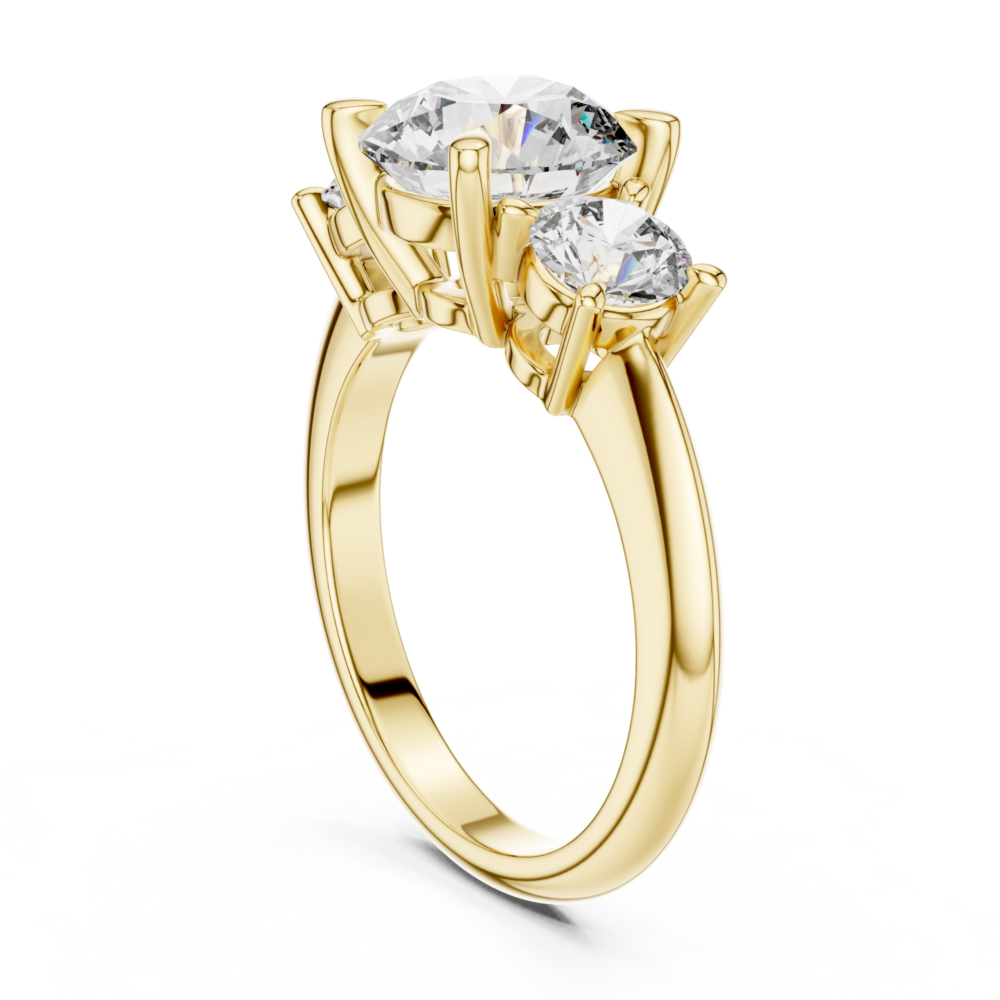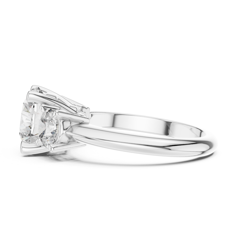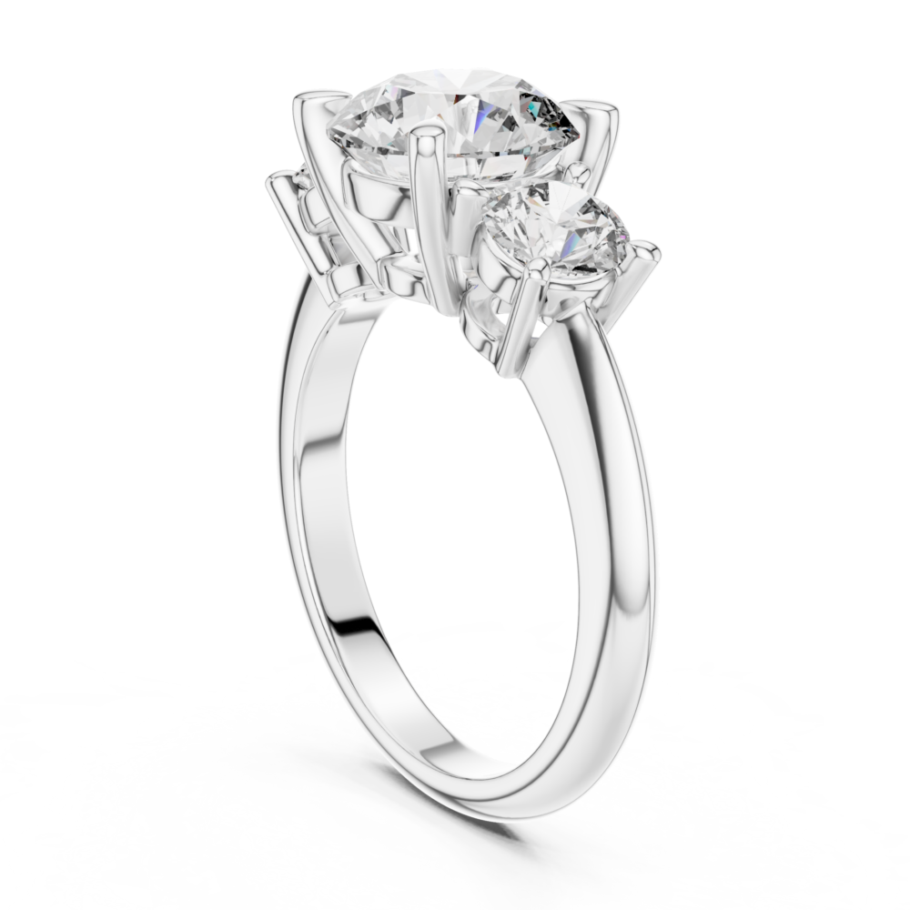 For those who love the classic round cut, this ring features a substantial center stone flanked by two large round side diamonds. The prominent side stones create a wall of sparkle across the finger. A truly breathtaking and traditional engagement ring choice.