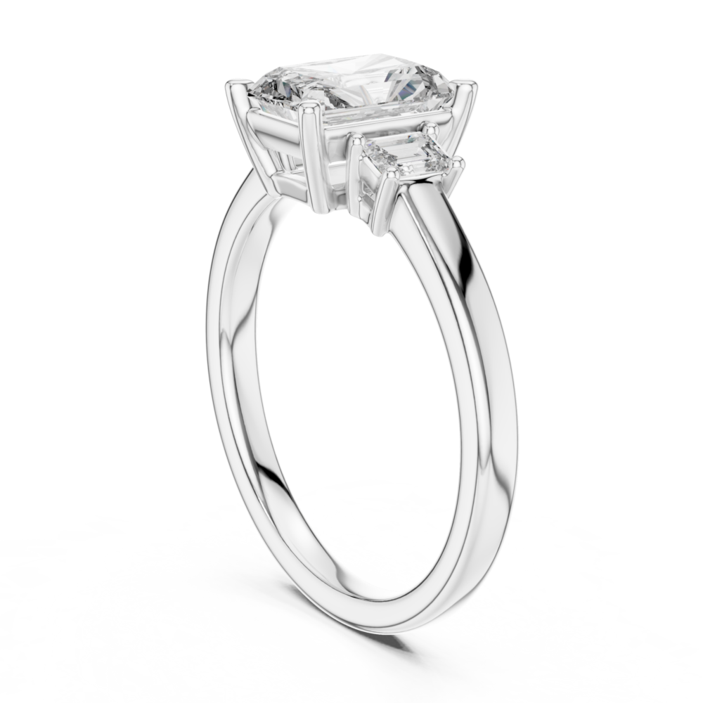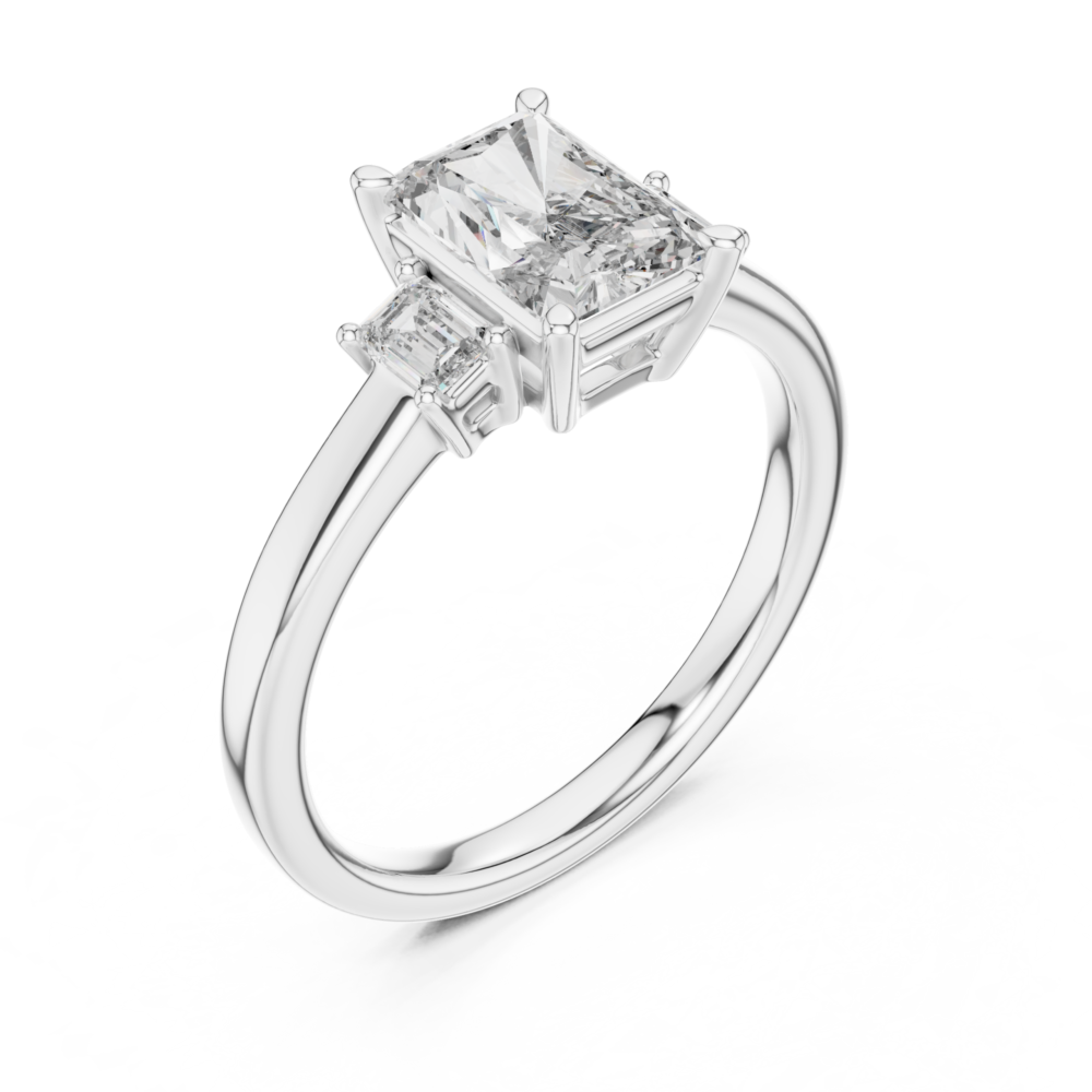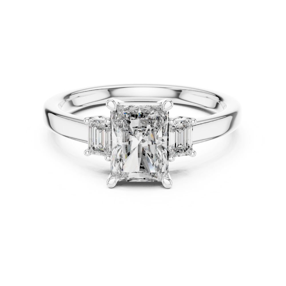 A lover of symmetry and geometry will adore this ring. It features an emerald-cut center flanked by matching step-cut side stones (likely baguettes or trapezoids). The long lines and clear facets create a sophisticated, hall-of-mirrors effect that exudes vintage Hollywood glamour.