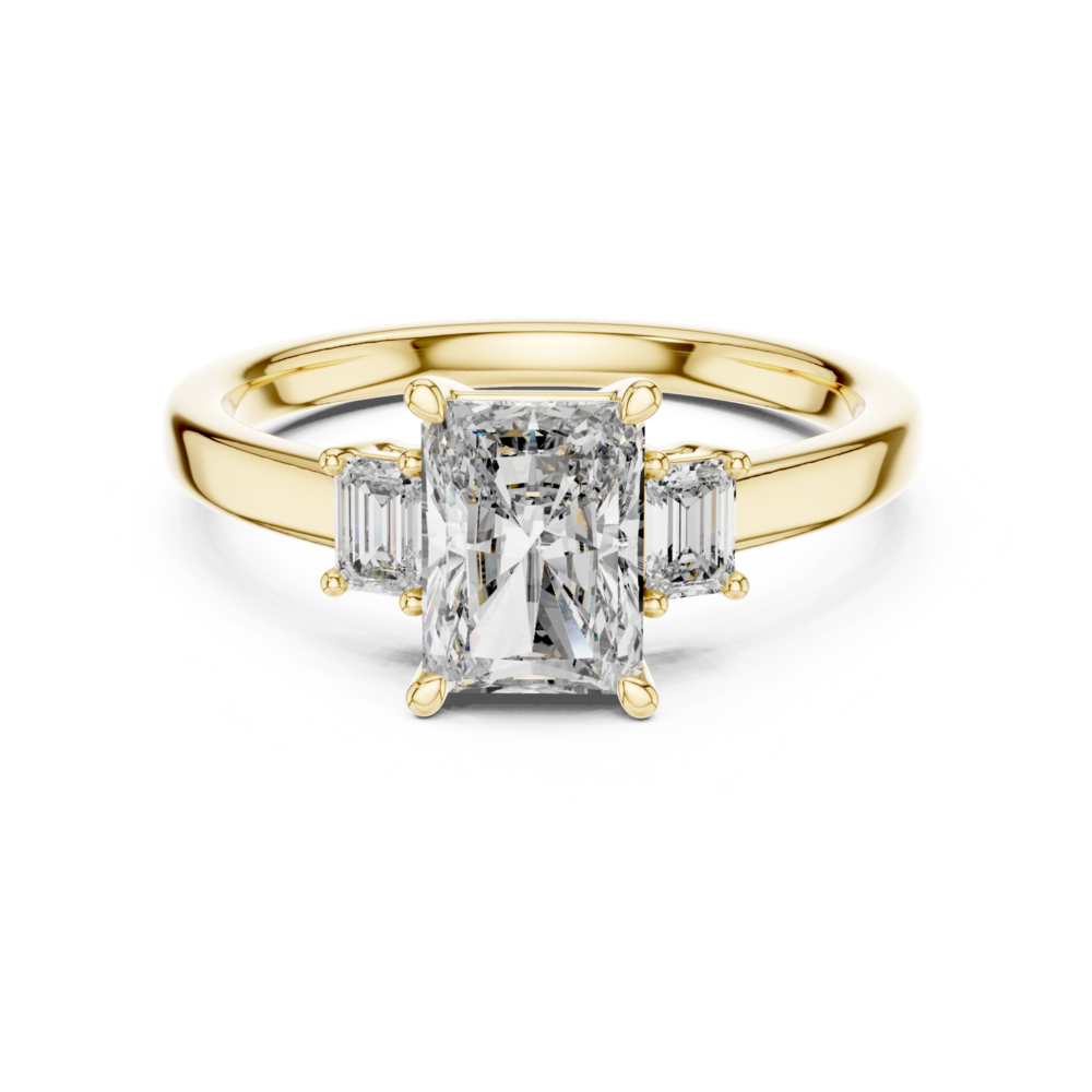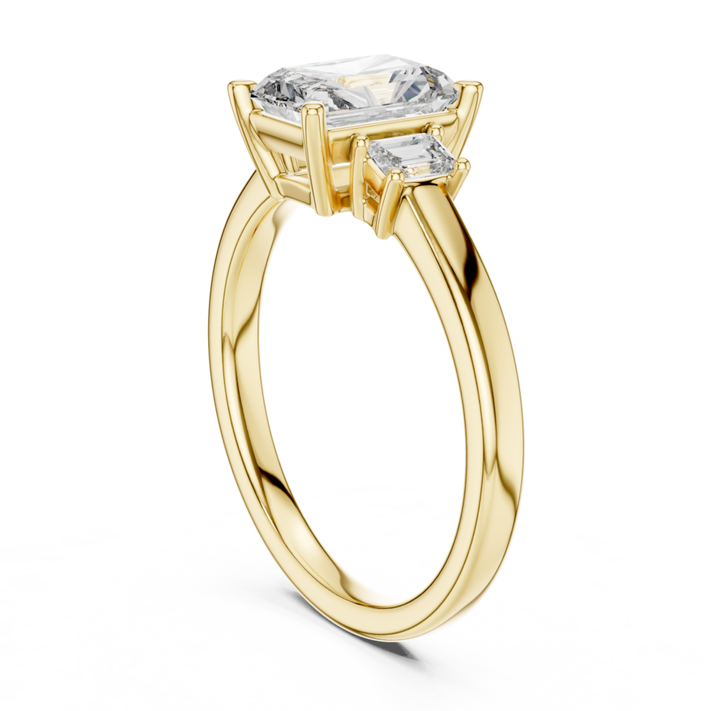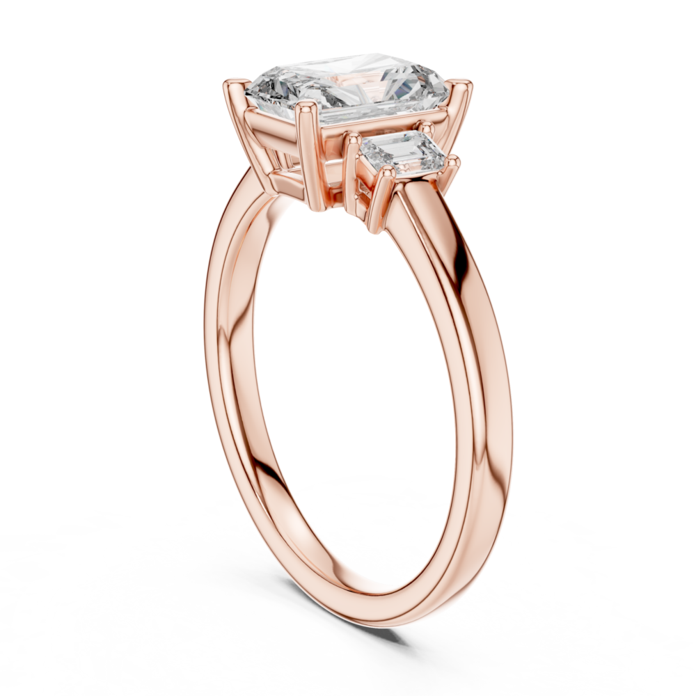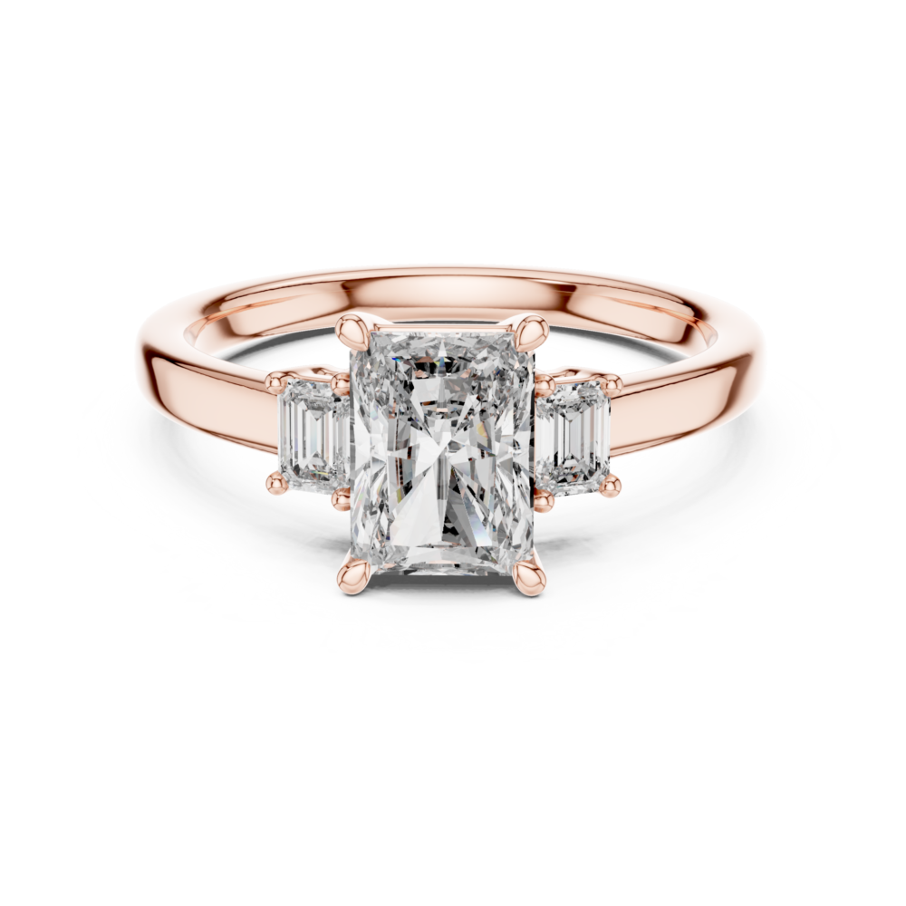A lover of symmetry and geometry will adore this ring. It features an emerald-cut center flanked by matching step-cut side stones (likely baguettes or trapezoids). The long lines and clear facets create a sophisticated, hall-of-mirrors effect that exudes vintage Hollywood glamour.