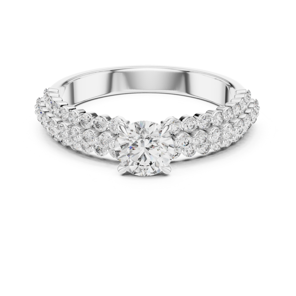 Make a bold statement with this luxurious multi-row ring. Featuring a prominent round lab-grown diamond center, the thick band is encrusted with rows of shimmering pave-set diamonds. The substantial width provides a rich, opulent look that exudes confidence and glamour, making it an ideal anniversary gift or right-hand ring.