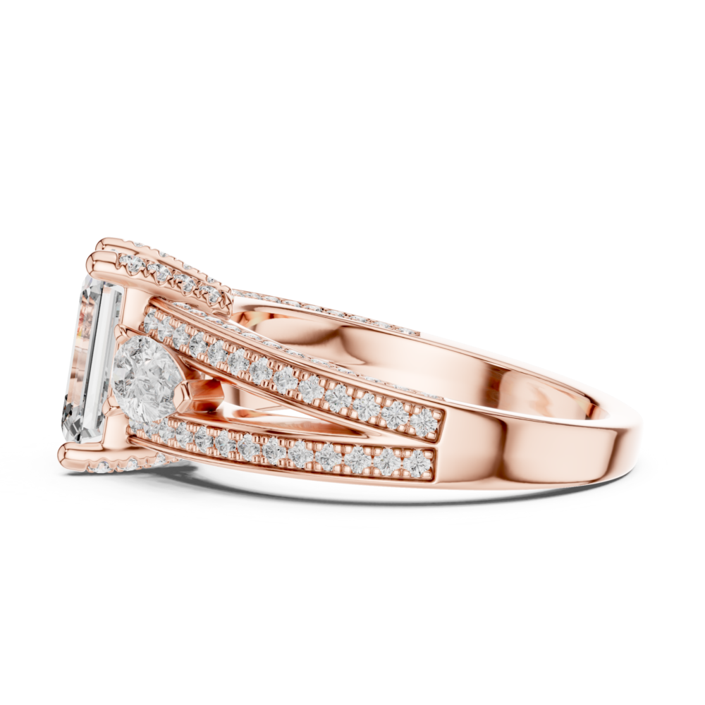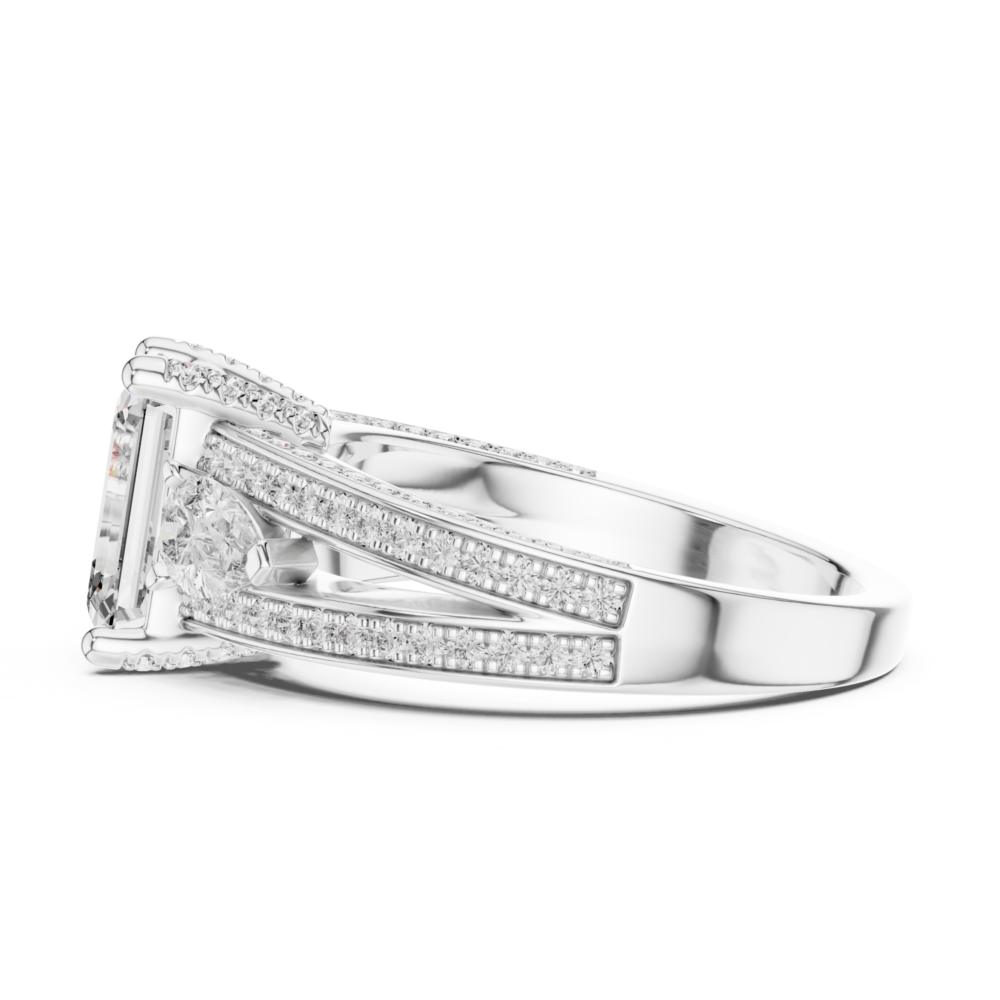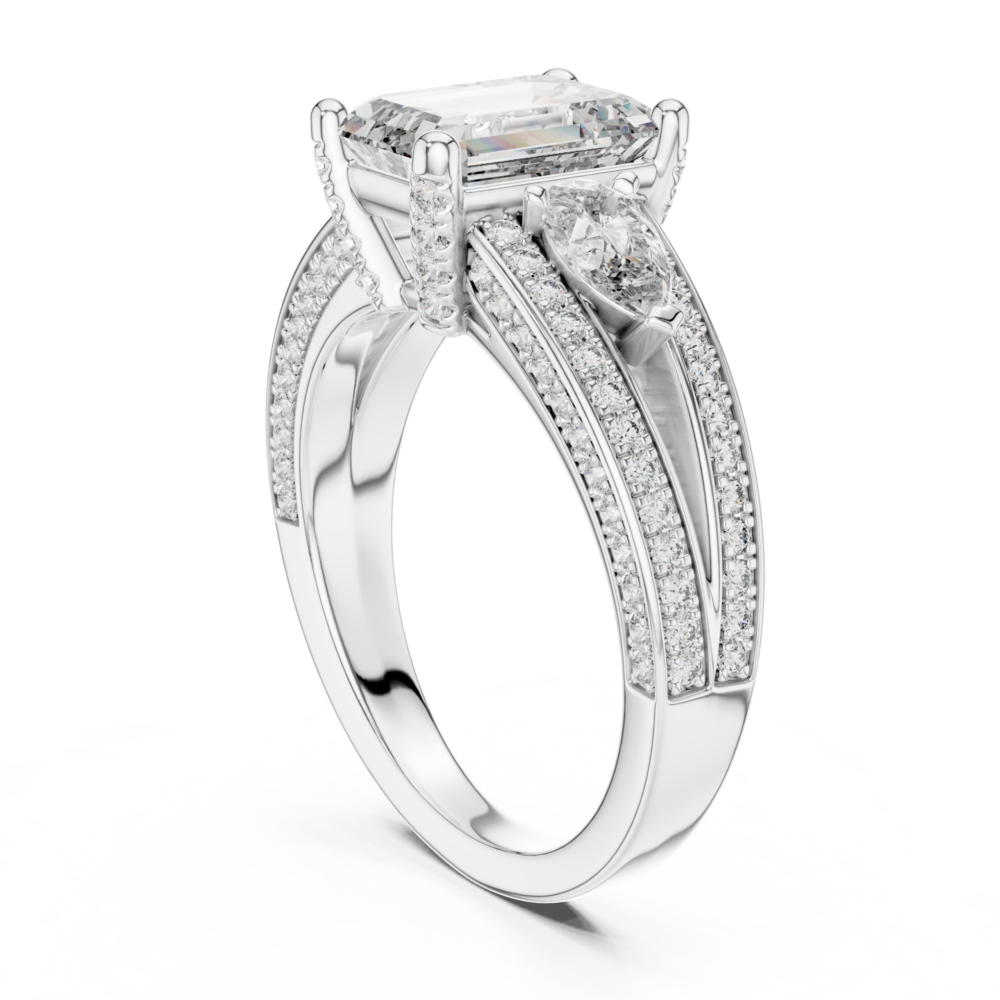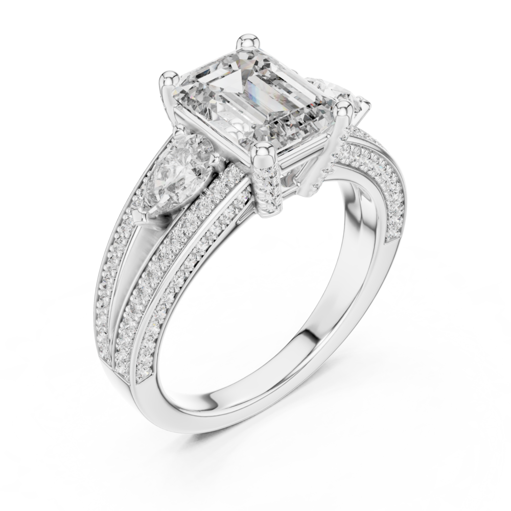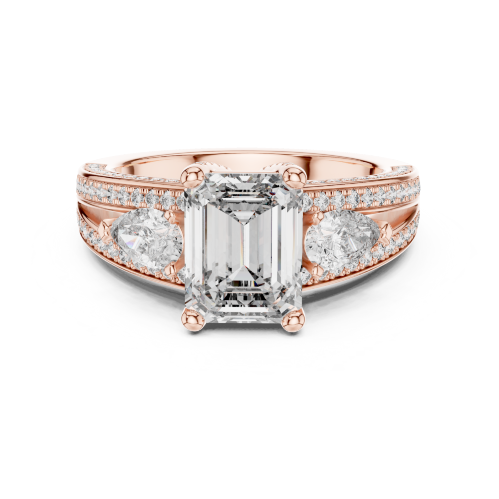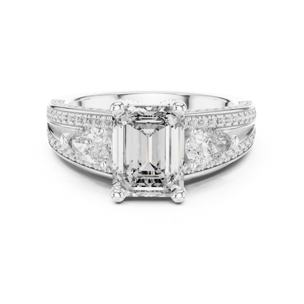 This design mixes the architectural lines of an emerald-cut center with the soft curves of pear-shaped side stones. The contrasting shapes create a unique visual interest and a vintage-inspired silhouette. A refined choice for the discerning collector.
